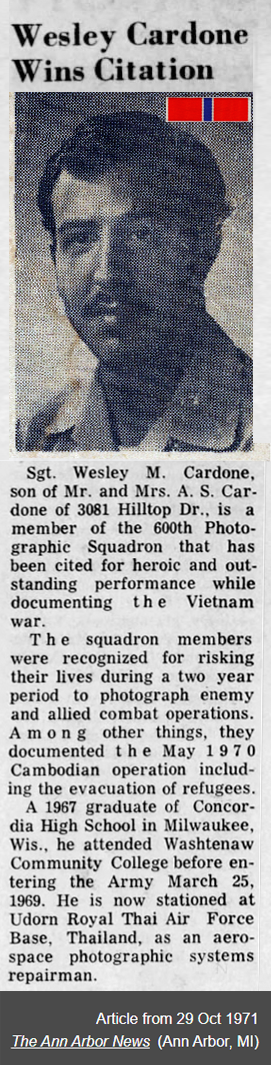 Upon completion of his basic military training at Lackland Air Force Base, Airman Cardone was assigned to attend the Air Force seven-month Aerospace Camera Training school at Lowery AFB, Colorado. At that training school, students learn details of both reconnaissance and combat cameras (still and motion picture) used at that time by Air Force combat jets.