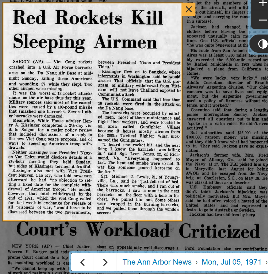 The Ann Arbor News reported it from a global news release, probably about two or three days before my letter to my folks arrived informing them of my arrival in Da Nang. They had no clue that I had been deployed to anywhere, nowhow.